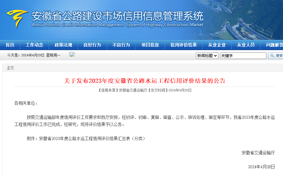 4月29日,安徽省交通運輸廳發(fā)布消息,安徽省華軒交通建設工程有限責任公司在2023年度公路水運工程信用評價工作中,被評定為安徽省2023年度公路養(yǎng)護施工企業(yè)信用AA級單位。